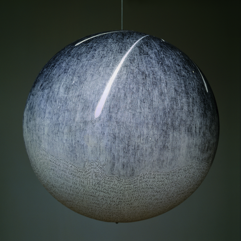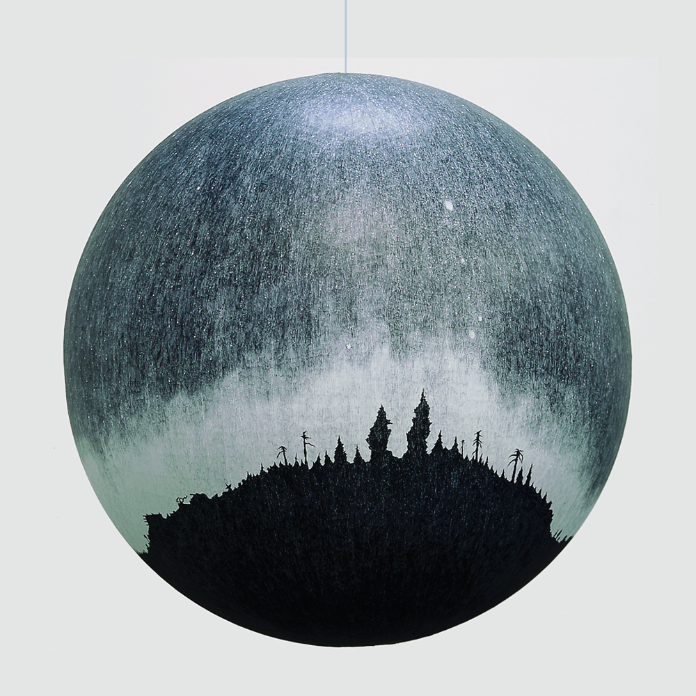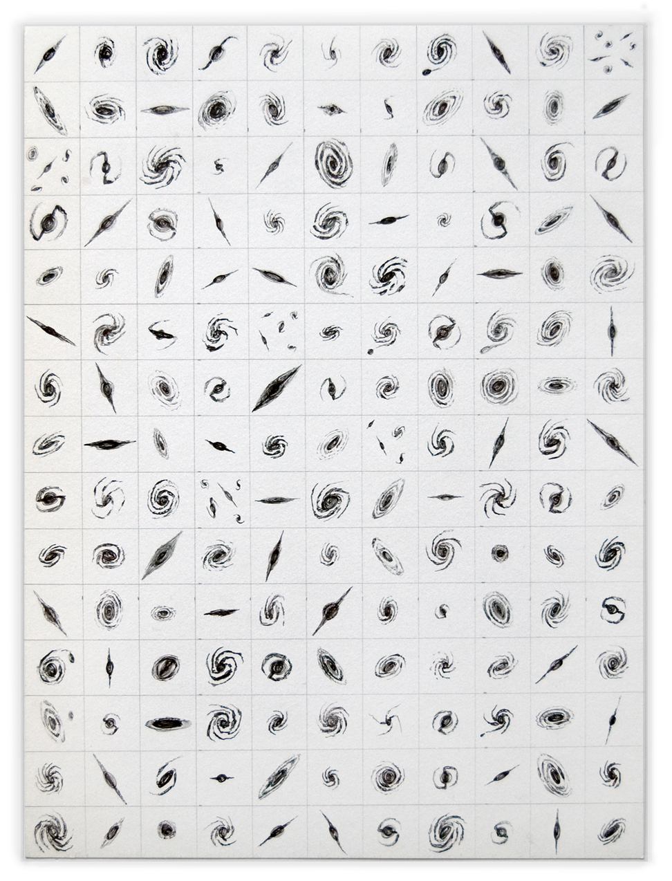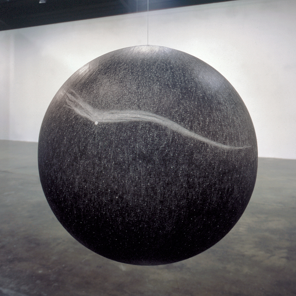 The evolution of the astronomy work began with flat drawings (on sheets and in books) of stars and deep sky objects, often in a grid format, other times within a circular motif, as you would see it through the telescope's viewfinder. It was a natural progression for the drawings to move from circular to spherical and in the late 1990's, Russell began creating his signature globe drawings, introducing three-dimensional sculptural elements into his work.