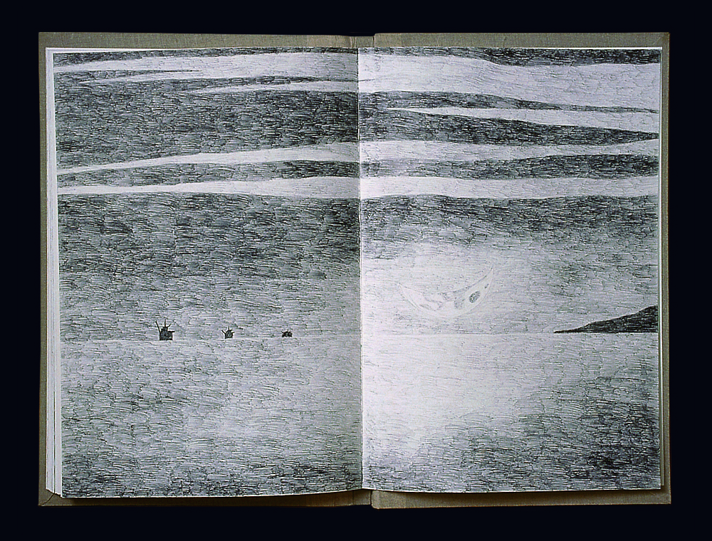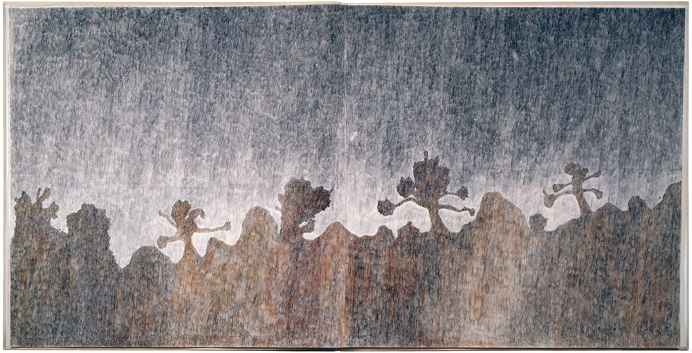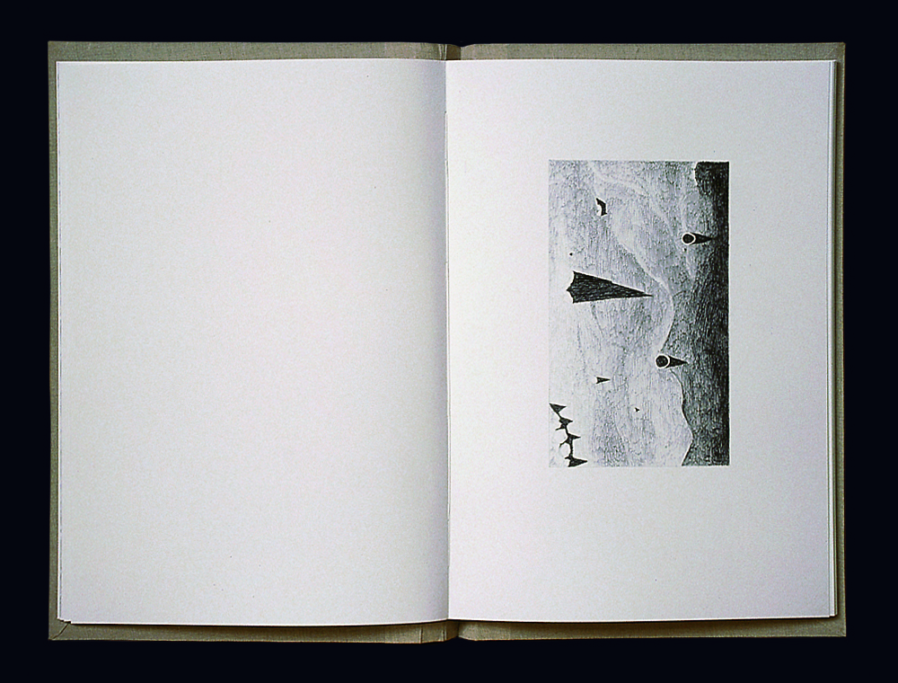 ink and watercolor on paper and vellum in 6 pages bound in rugged canvas on wood and metal table