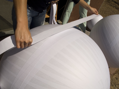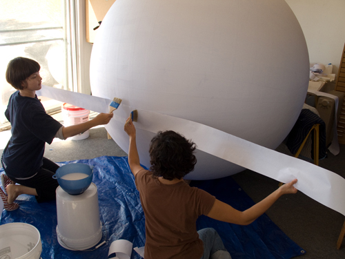 Lucia and Gabi coating globes with japanese paper and wheat paste